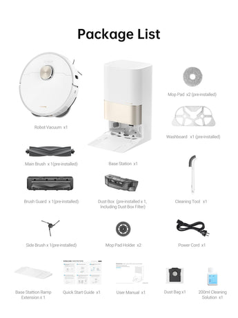 Included Components Mop Pad Holder x2, Cleaning Tool x1, Robot Vacuum x1, Base Station x1, Quick Start Guide x1, User Manual x1, 200ml Cleaning Solution x1, Power Cord x1, Base Stattion Ramp Extension x 1 See more