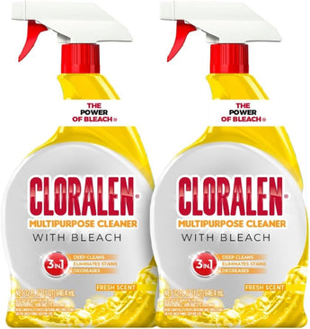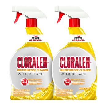 Cloralen's 3-in-1 Multipurpose Cleaning Spray is perfect for tackling dirt, grease, and grime in your home. This 32 oz spray bottle contains a powerful formula that deep cleans sinks, tiles, hard surfaces, and helps remove stains. The ergonomic spray bottle allows you to easily apply the cleaning solution to a variety of indoor surfaces. Cloralen not only cleans, but also deodorizes, leaving a fresh scent behind. Safe for use on kitchen and bathroom surfaces. This pack contains 2 32 oz spray bottles, so you can stock up and keep your home clean. Key features include:- Tough on dirt, grease and grime - Cleans sinks, tiles, hard surfaces and helps remove stains- Deodorizes and removes tough odors - Powerful formula with bleach - Easy to use spray bottle - 32 oz size (2 pack)- Fresh scent